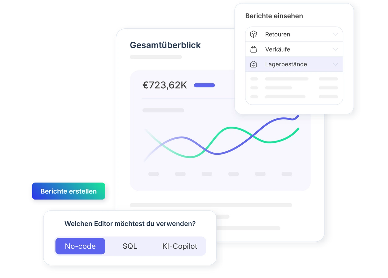 Nutze verschiedene Berichten zur Analyse von Verkäufen, Lagerbeständen, Retouren und mehr. Erhalte deine Ergebnisse ganz ohne selbst erstellte Datenabfragen.